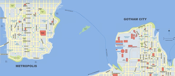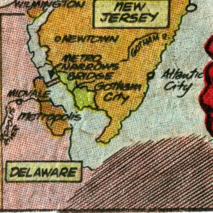 Later Portrayals have Gotham City in New Jersey, positioned across from Metropolis in Delaware. This has pretty much stayed the case ever since, but with Gotham’s position and shape varied over time. I think it works for narrative purposes.